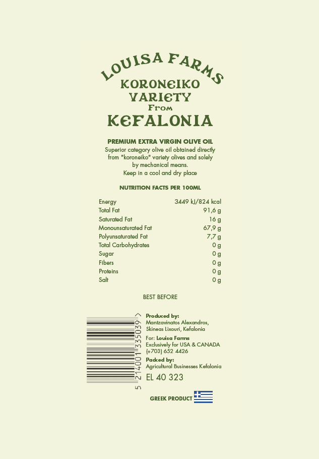 Louisa Farms KORONEIKO is a high bio-phenol Extra Virgin Olive Oil from the KORONEIKI olive variety, with low acidity and a smooth taste reminiscent of a variety of fruits.